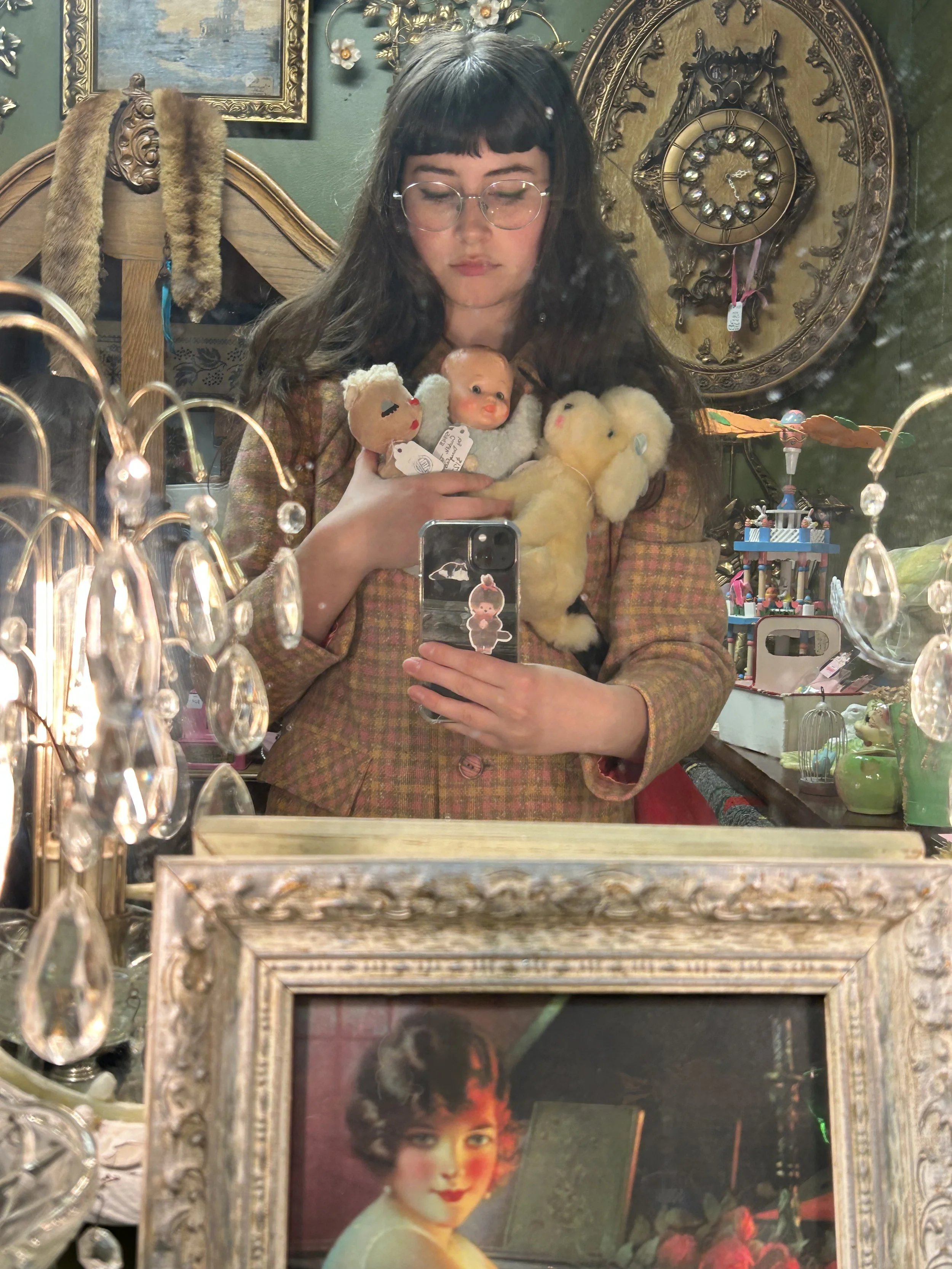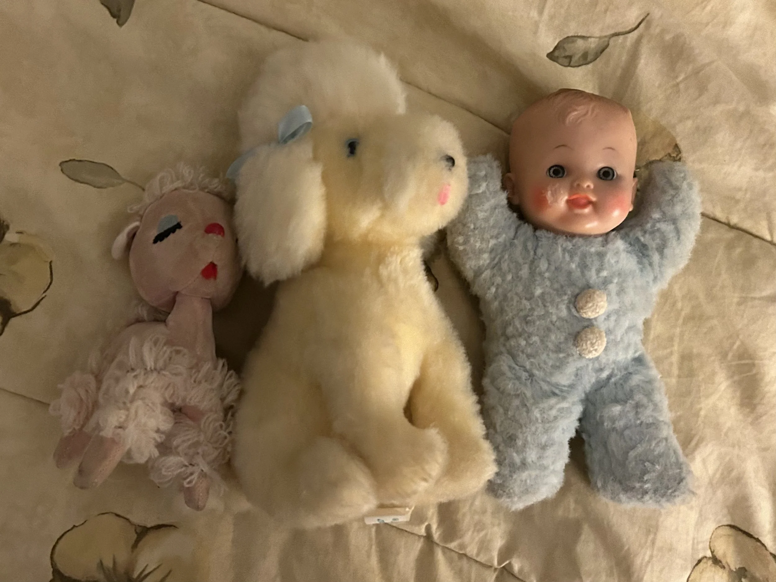 I researched each of them online when I got back to my apartment that night, where I found out that the baby doll is from the fifties, the lamb from the sixties, and the poodle from the seventies. The lamb is more specifically named “Lucy Lamb” and she is a Dream Pet from the brand Dakin. She was made in Japan and is stuffed with sawdust, hence why she’s really stiff feeling. She used to have a bow around her neck which is missing now. But that’s okay. The baby doll is by the brand Douglas. The poodle, interestingly, is also by Dakin, and is called a “Pillow Pet”, but obviously a different kind of pillow pet than what Gen Z knows and loves. Anywho…I’m very satisfied with these purchases. And the three of them all together was only $35. That’s a steal for three items that are bringing me such happiness. And spanning three decades! Three decades of stuffed animals that were all meant to be best friends. And now they can be.