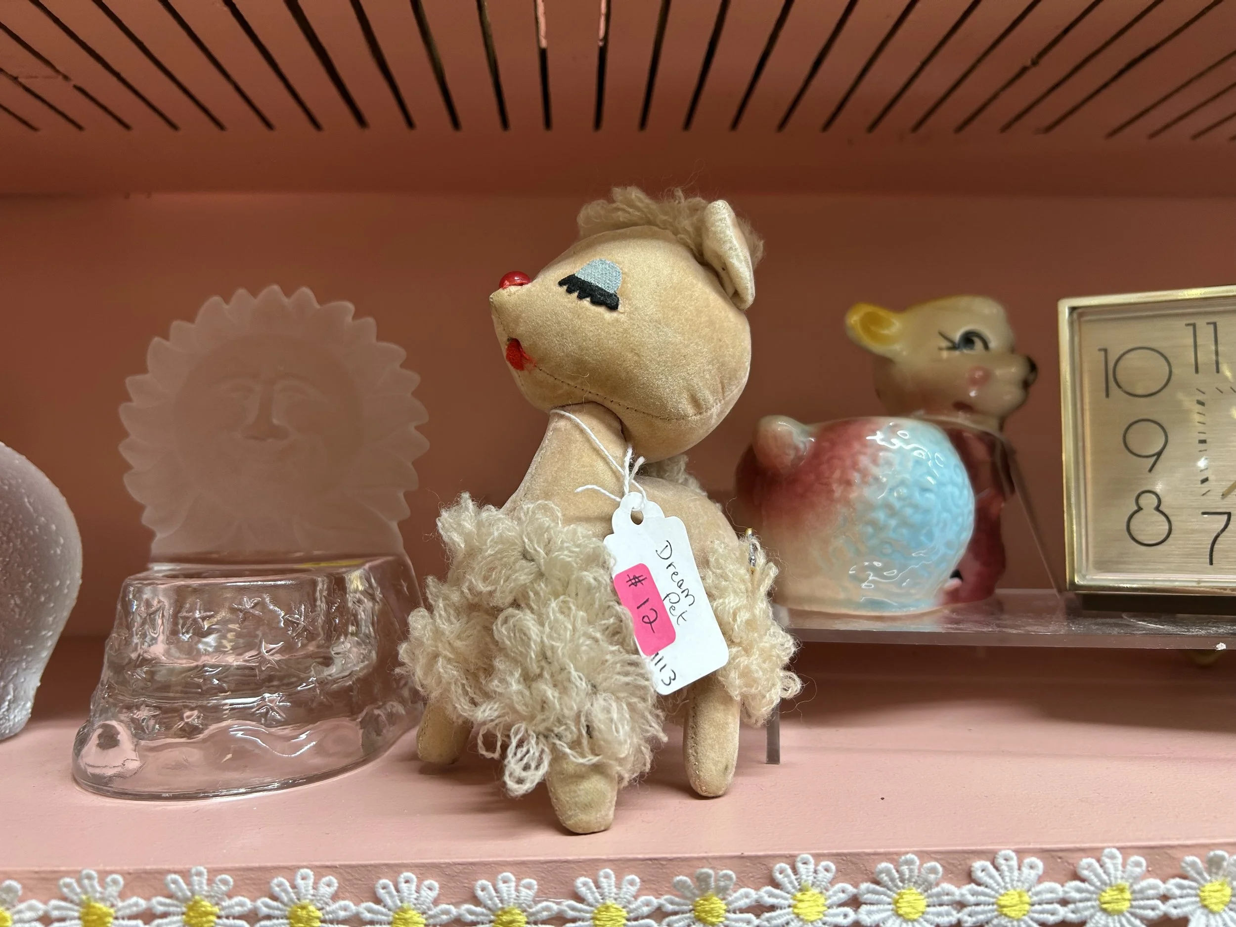 Then, I made my way over to another booth, where I found an off-white fluffy poodle stuffed animal with gorgeous blue bows on its ears. I immediately grabbed it. I also happened to notice a VHS tape of the movie Overboard, which I decided was another act of fate. Allison and I had just been discussing Kurt Russell since she showed me the movie The Thing. As I walked further through the booth, I came across a light pink shelf built into the wall decorated sweetly with various trinkets. In the center, there was a light pink animal of some sort. A sheep? I grabbed it and knew it was very vintage. It was faded, very stiff, and couldn’t stand up on its own. I pondered this one for a moment. Do I need her? Am I just distracted by the satisfying image of a pink animal perfectly centered on a pink shelf? Do I really need to buy three things in one go? Yes. Yes I do. And then she was mine.