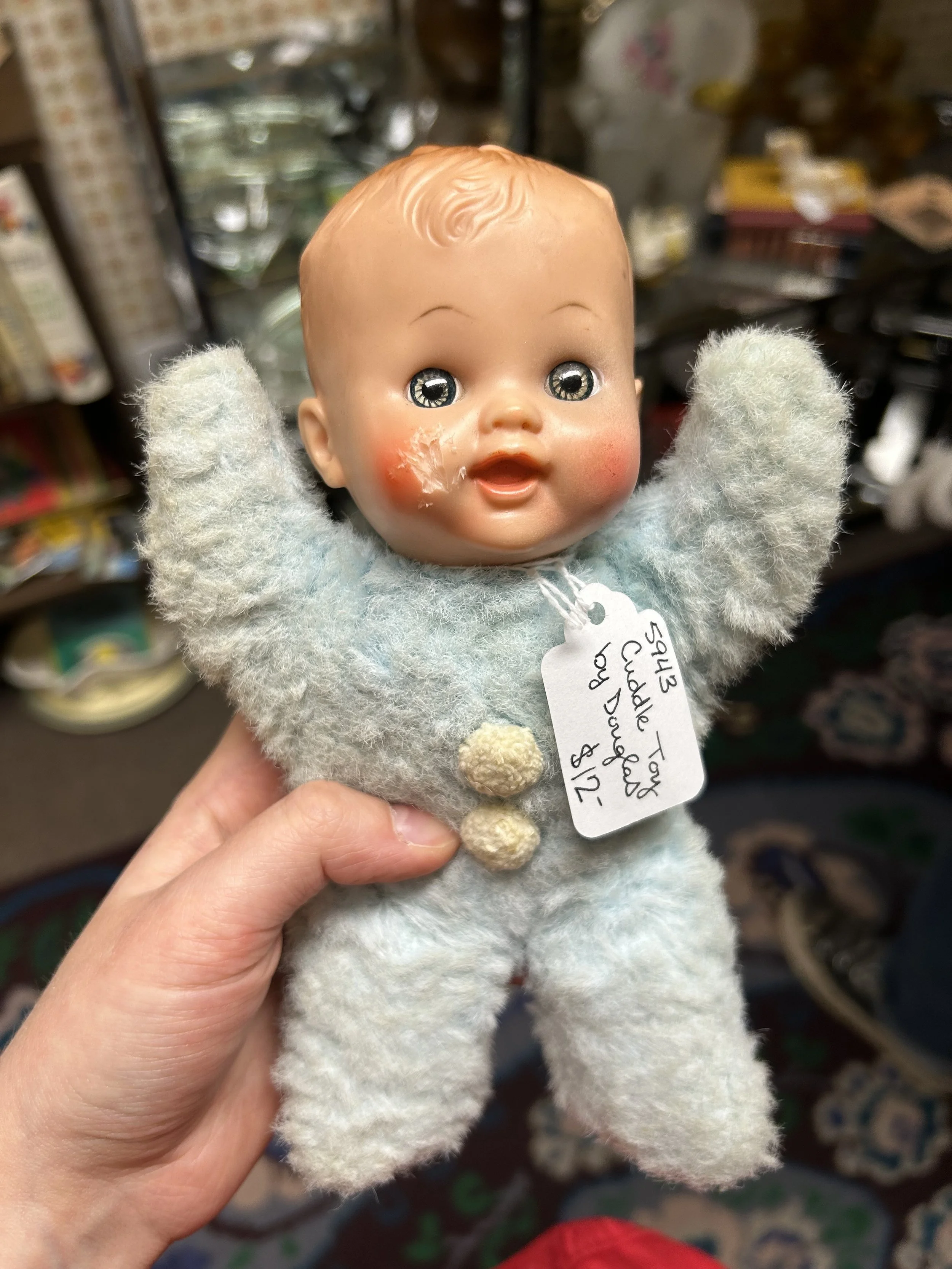 And lo and behold… in the next booth over, tucked away on the bottom of a bookshelf, sat a tiny baby doll with a fuzzy blue plush body. I picked it up and immediately knew it had to be mine. Sophie walked in and went, “oh my god, why is that so cute?” That’s my baby.